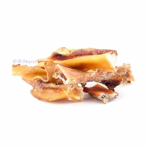 Puur gedroogde runderkophuid, een taaie en zeer harde snack voor uw hond. De hond moet lang kauwen op dit kauwproduct om het zachter te maken, dus ideaal voor het gebit.