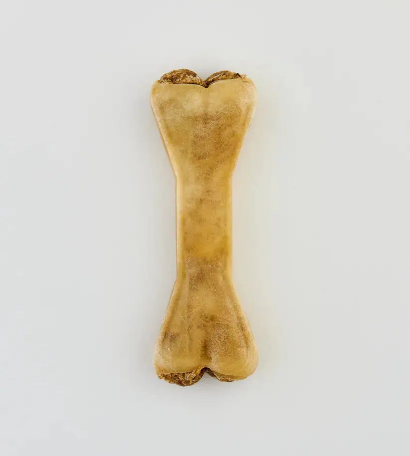 Geperst bot van buffelhuid gevuld met pensmeel (22cm), voor lekker lang kauwplezier.