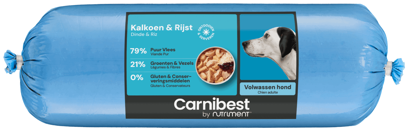 Deze voeding is 100% hypoallergeen en bevat uitsluitend kalkoen als dierlijke eiwitbron. Kalkoen/rijst is uitermate geschikt voor honden welke een eliminatiedieet voorgeschreven hebben gekregen, om uit te sluiten of de hond allergisch of intolerant is voor andere dierlijke eiwitten. Het principe is gelijk aan Carnibest Eend/Rijst, waardoor men nu een keuze heeft uit 2 eliminatiediëten.