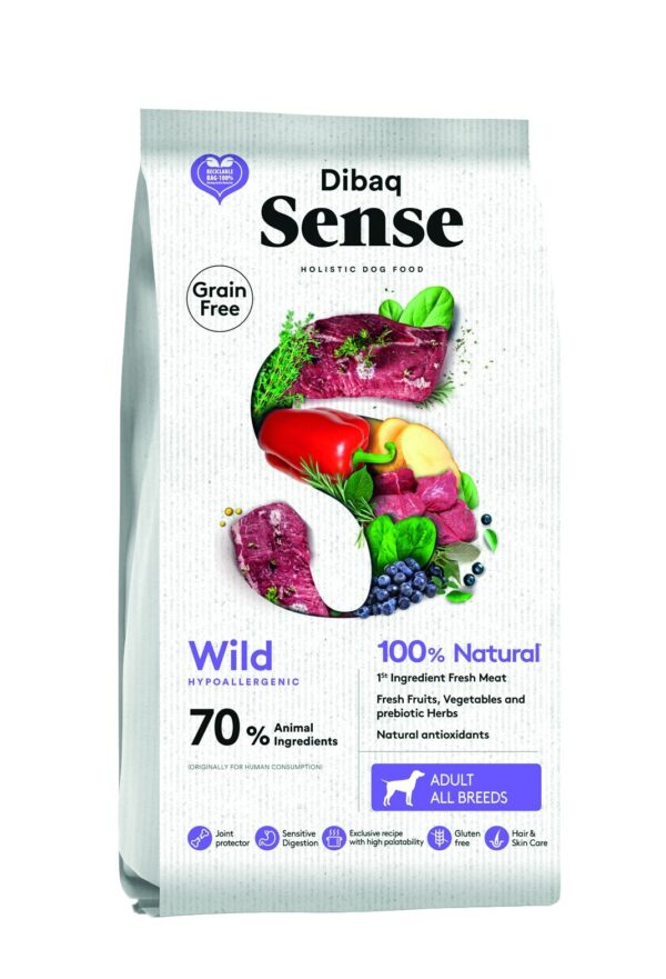 Dibaq Sense graanvrij wild is een recept met vers hertenenvlees & vers wild zwijnenvlees, daarom is het perfect voor honden met een gevoelige spijsvertering of intolerantie voor andere vleessoorten. Het is een complete voeding met een hoge nutritionele inhoud. Evenals hypoallergene voeding draagt het bij aan de spijsvertering en door toevoeging van het gewrichtsbeschermingspakket, zorgt het voor sterke en soepele gewrichten. Hierdoor zorgen wij  voor de gezondheid van uw hond. Alle ingrediënten zijn specifiek gekozen voor hun hoge voedingswaarde en lage allergische capaciteit. Dus gevoelige maagjes en darmen zijn met Dibaq Sense grainfree wild ook op hun gemak.