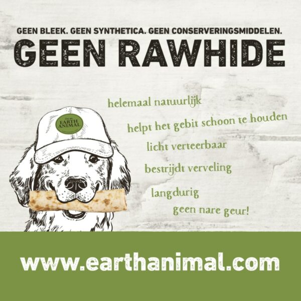 Deze kauwsnack van Earth Animal is gemaakt van 100% natuurlijke ingrediënten en is het alternatief voor de Rawhides. Er is dus geen gebruik gemaakt van bleekmiddel, kunstmatige toevoegingen of conserveermiddelen. Een gezonde kauwsnack voor je hond dus!