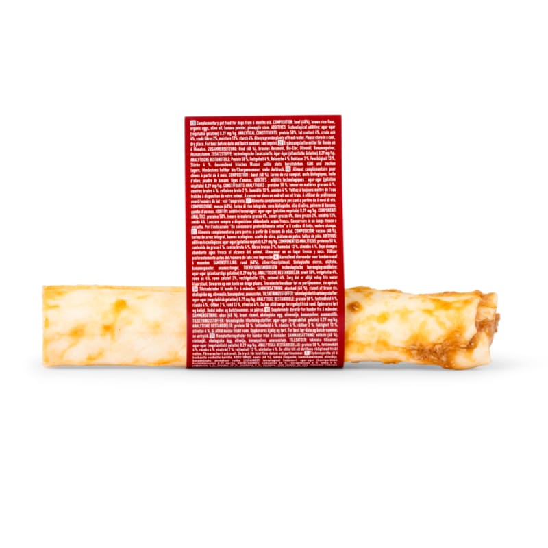 Ingrediënten: Weide rund (48%), bruine rijstmeel, eieren, olijfolie, bananenpoeder, ananas stengel, agar-agar (plantaardige gelatine) 0,29mg/kg