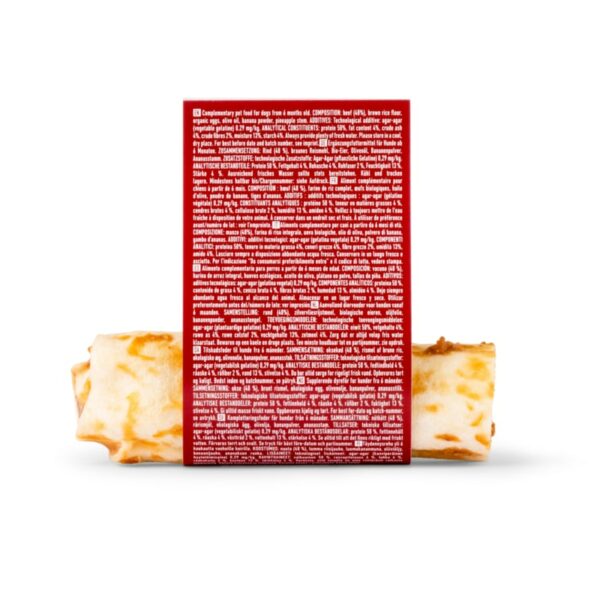 Ingrediënten: Weide rund (48%), bruine rijstmeel, eieren, olijfolie, bananenpoeder, ananas stengel, agar-agar (plantaardige gelatine) 0,29mg/kg