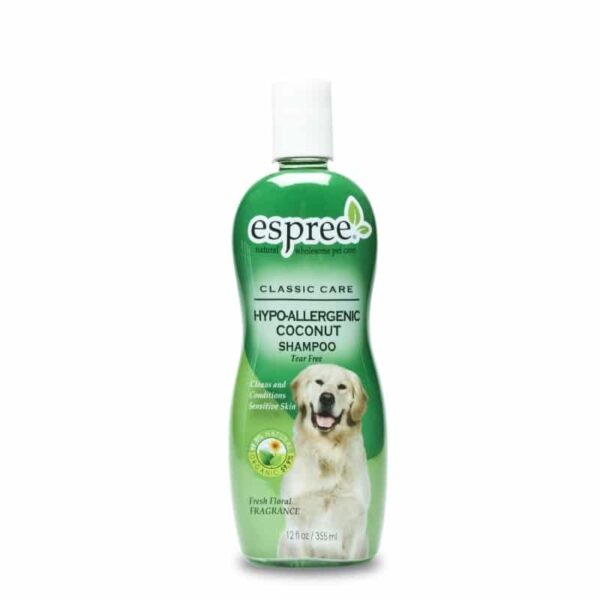 Soms is het nodig om je hond te wasseen, deze Espree hondenshampoo is geschikt voor honden met een gevoelige huid & vacht. Traanvrije, natuurlijke, reinigende shampoo. Door aloë vera, vitamine A, D en E en kokosnoot is de kans op een allergische reactie gering.