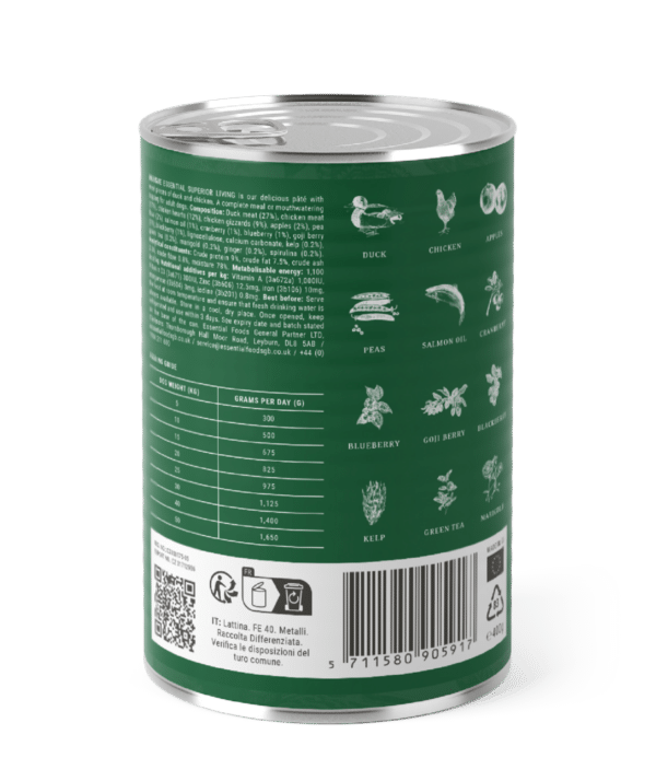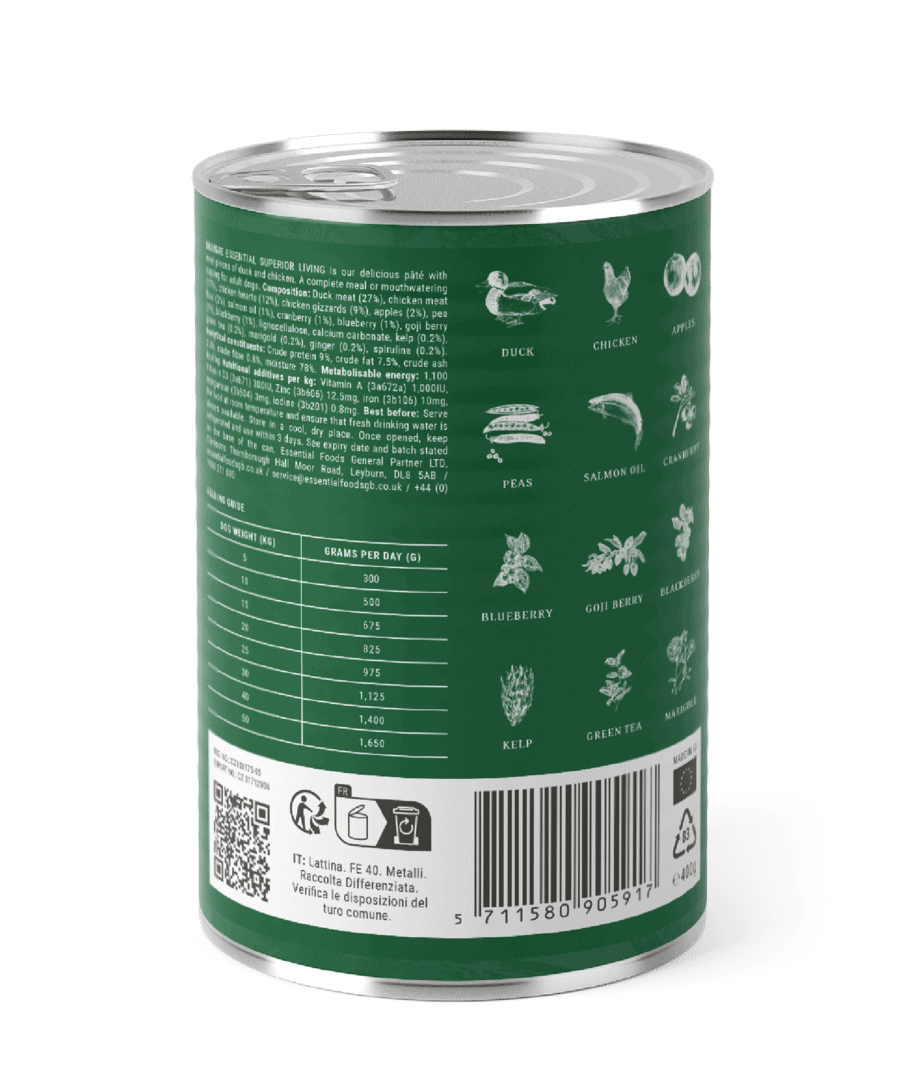 Essential Foods Superior Living is een heerlijke paté van hoge kwaliteit met vleesstukjes van eend en kip. Een complete maaltijd of verrukkelijke topping voor volwassen honden van alle rassen en groottes.
