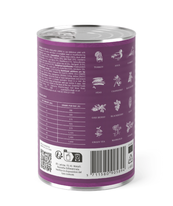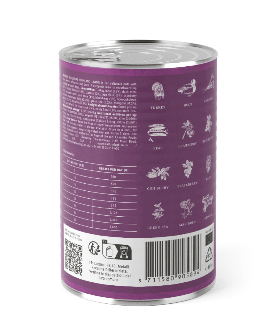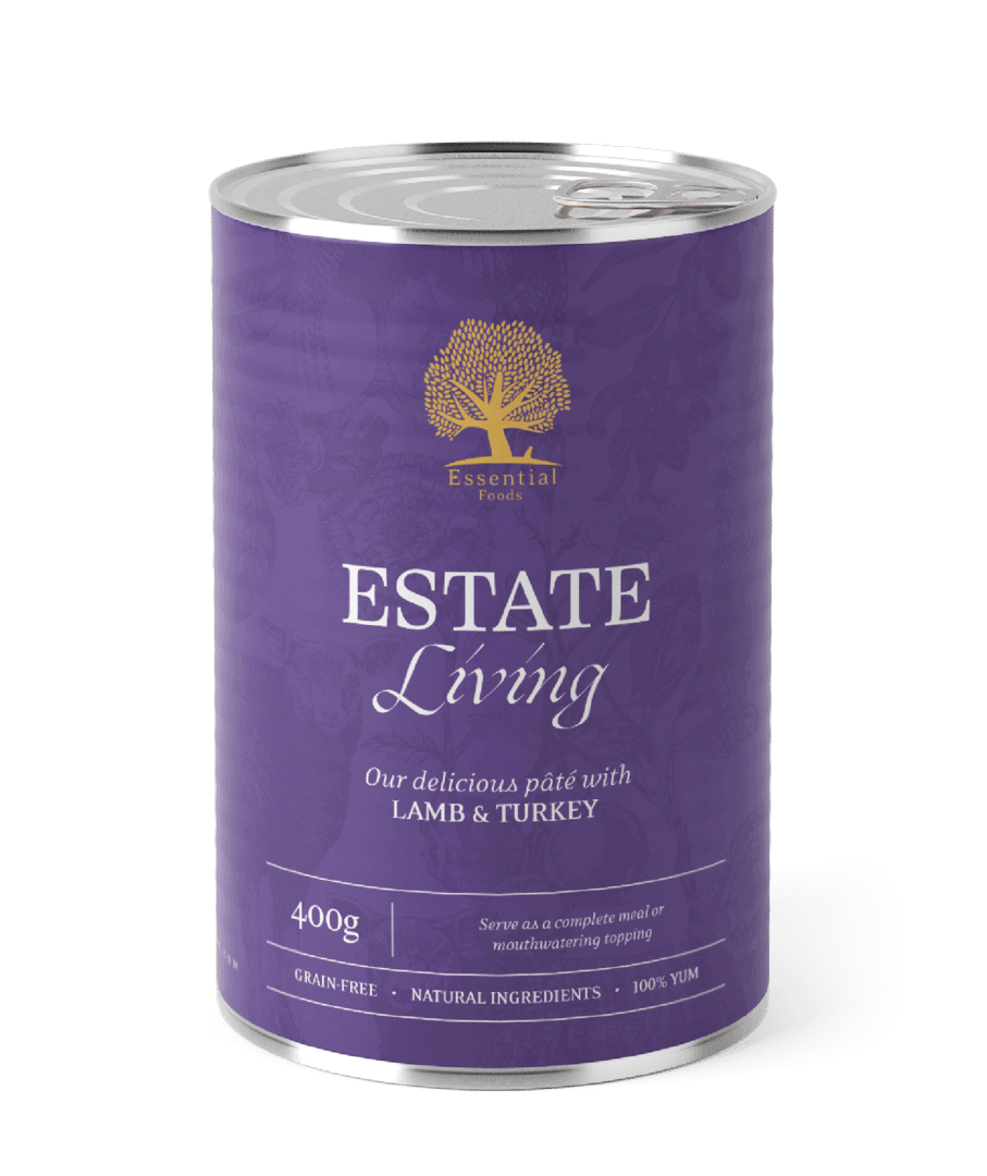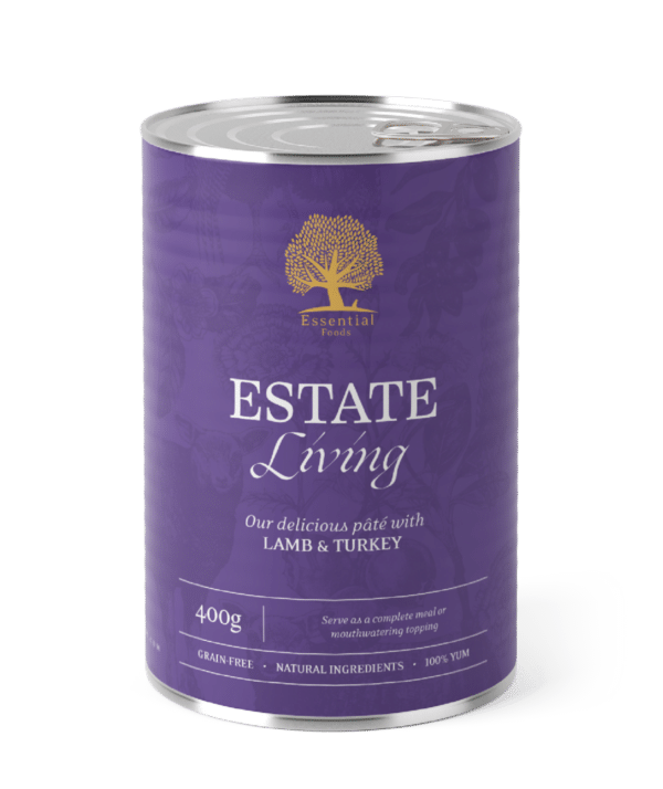 Essential Foods Estate Living blikvoeding is een heerlijke paté met lamsvlees en kalkoen voor volwassen honden. Het kan worden geserveerd als een complete maaltijd, maar smaakt net zo goed als een overheerlijke topping over de brokken. Het is graanvrij, uitsluitend op basis van lam en kalkoen en gemaakt met uitsluitend natuurlijke ingrediënten.