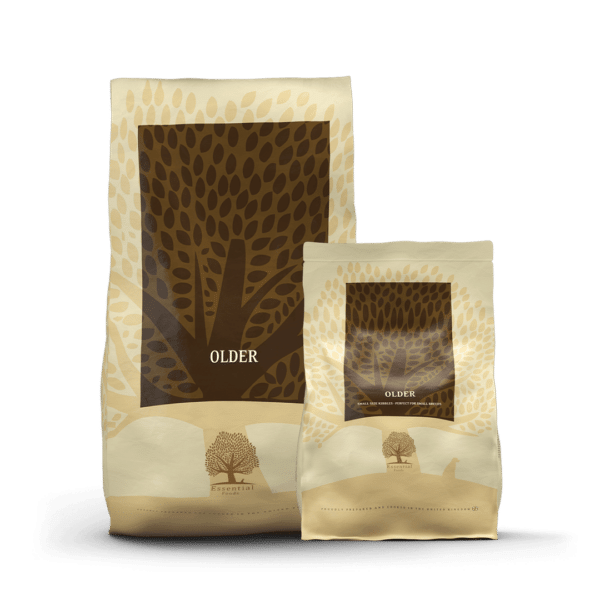 Essential Foods Older is een volledige maaltijd die speciaal voor oudere honden is ontwikkeld. Essential Foods older is een unieke graanvrije maaltijd met 78% verse en gedroogde scharrelkip en vrij lopende eenden, verantwoord gekweekte zalm en Salisbury regenboogforel en ei. Hiervan is 45% vers vlees en verse eieren (als % van het totale recept). Aangevuld met 22% groenten, zaden, kruiden, bessen, fruit, vitaminen en mineralen.