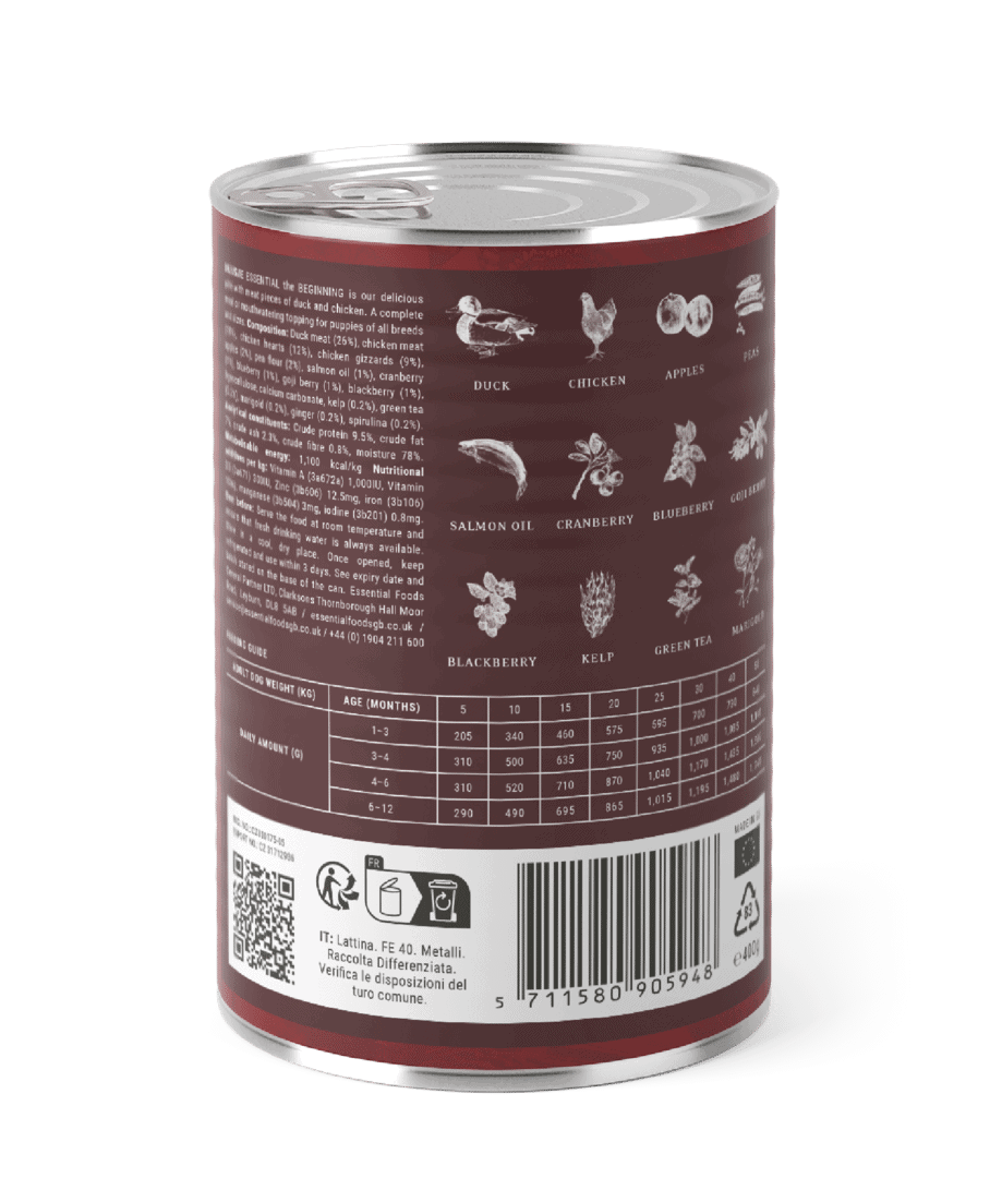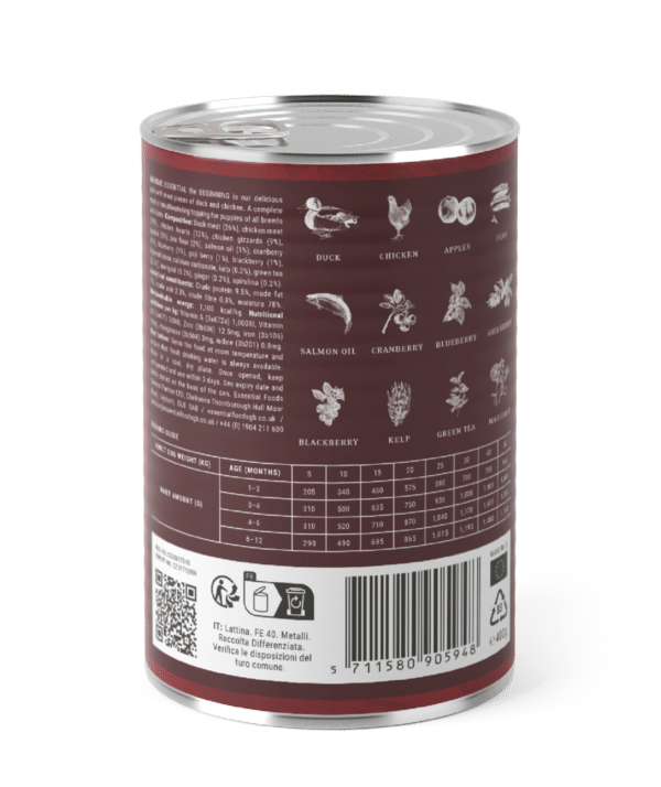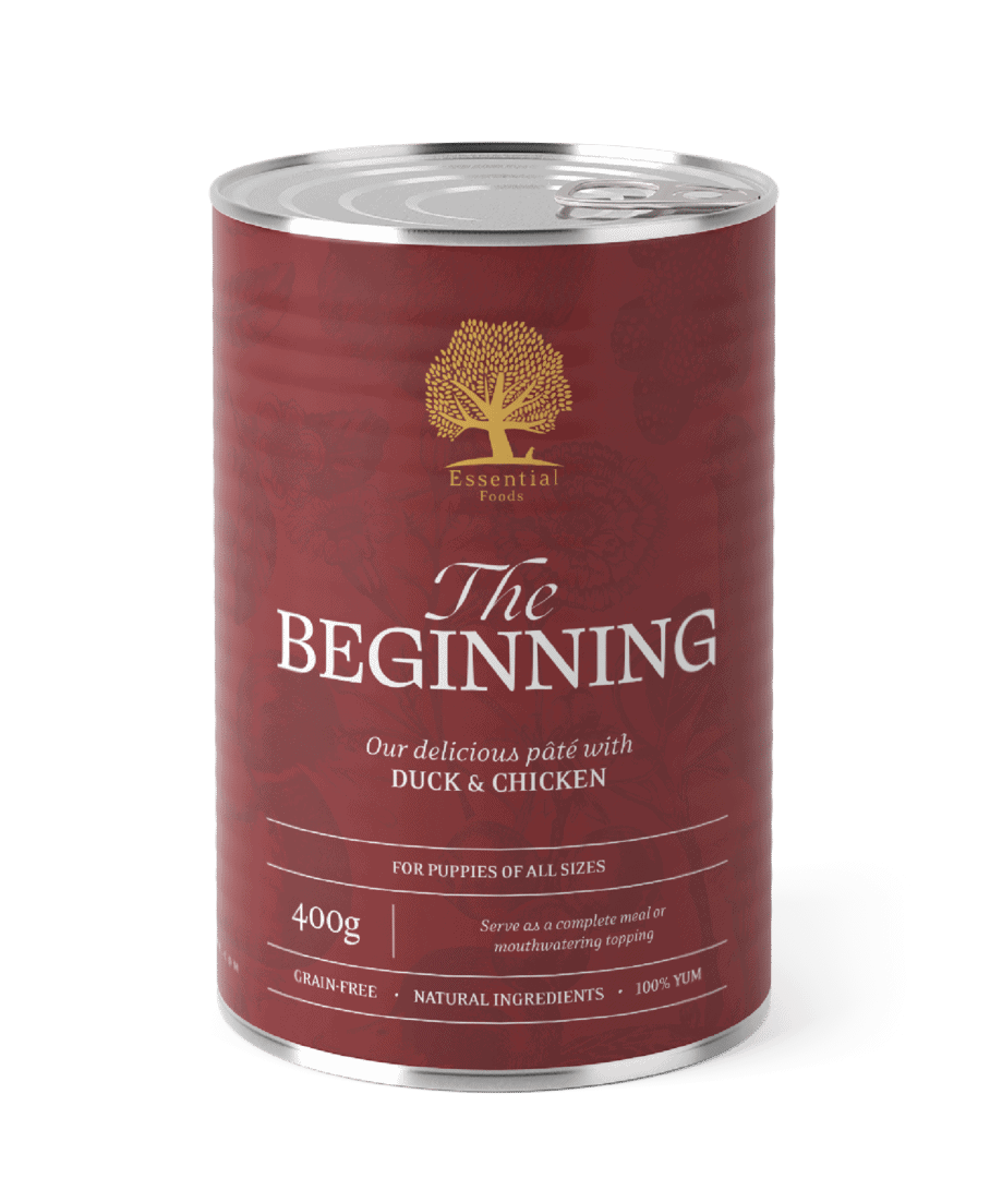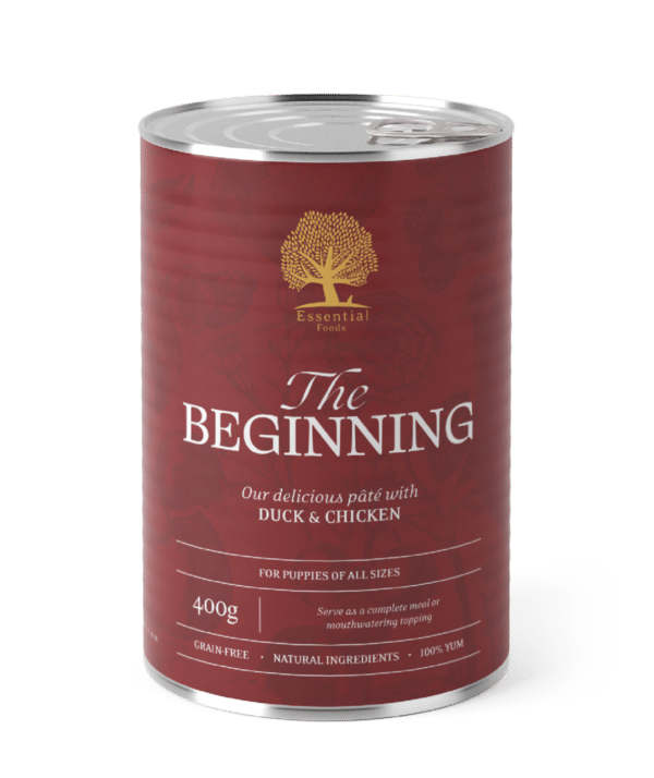 Essential Foods The Beginning blikvoeding is een heerlijke paté van hoge kwaliteit met vleesstukjes van eend en kip. Een complete maaltijd of verrukkelijke topping voor puppies van alle rassen en groottes.
