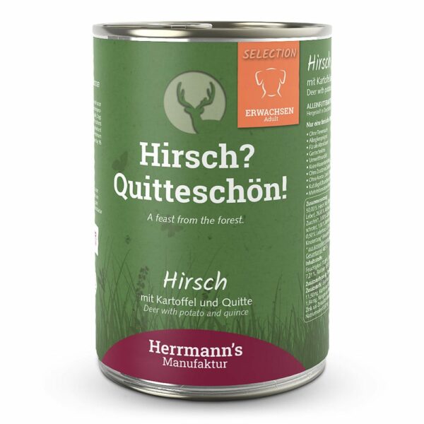 De sensitive blikvoedingen van Herrmann’s zijn volledige voedingen voor honden en voorzien van 1 dierlijke eiwitbron (monoproteïne). Hierdoor bijzonder geschikt voor honden met gevoelige maag/darmen of bepaalde intoleranties/allergieën. De voedingen bestaan uit 50 % vlees/vis aangevuld met groenten en fruit. Aardappel dient als bron van koolhydraten en vezels en kweepeer bevatten veel vitamine c en kalium. Hert kan ook gebruikt worden voor eliminatiediëten.