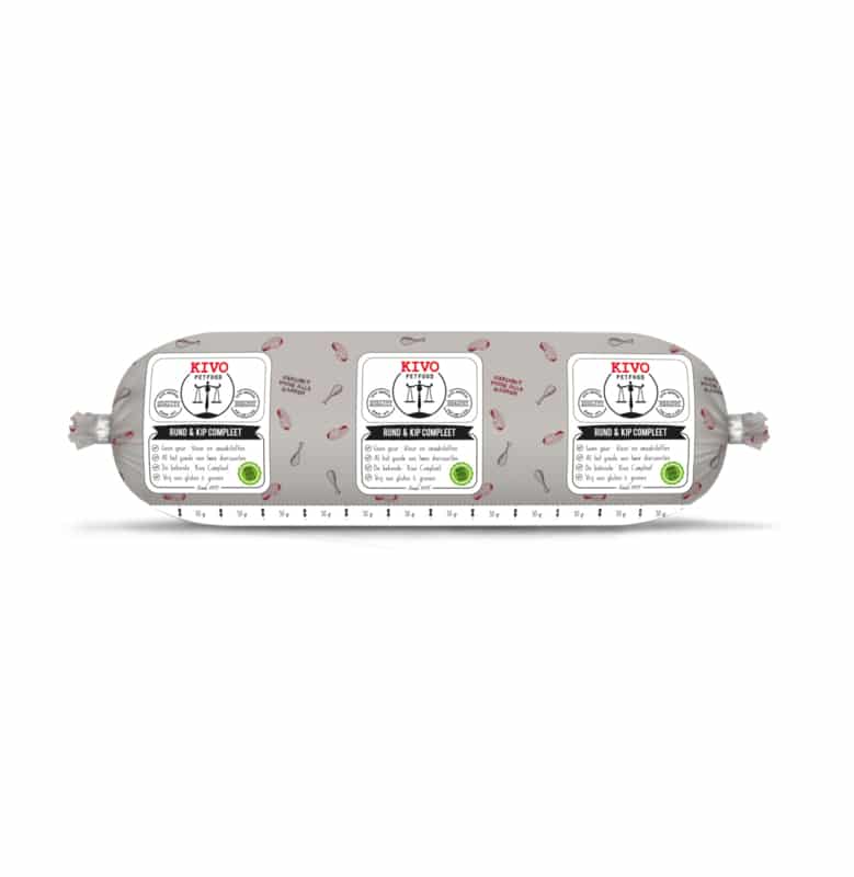 Deze voeding is een verse diepgevroren maaltijd die geschikt is voor elke hond. Deze voeding bevat vers rundvlees en vers kippenvlees. Deze maaltijd bevat alle essentiële voedingsstoffen, bouwstoffen, vitaminen en mineralen die uw hond dagelijks nodig heeft en is dus geschikt om elke dag aan uw hond te geven. De vitaminen en mineralen worden gewonnen uit natuurlijke bronnen. Deze bevatten hoogwaardige ingrediënten zoals organen als hart, nier, lever, long, pens en milt, ook bevat het spiervlees en karkas. Er worden geen kunstmatige stoffen of chemische vitaminen toegevoegd. Wel is het verstandig om meerdere diersoorten per week van Kivo of andere merken te voeren omdat je hond zo aan een groter scala aan verschillende bouwstoffen en aminozuren komt.