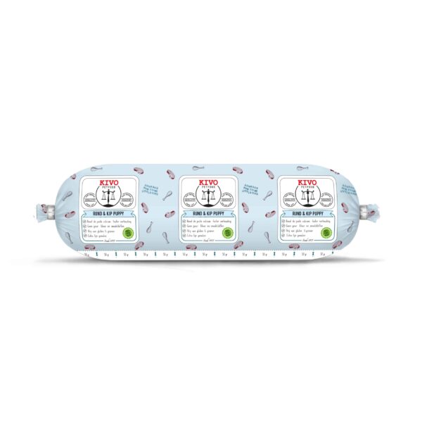 Deze voeding is een verse diepgevroren maaltijd die geschikt is voor elke pup. Deze voeding bevat vers rundvlees en vers kippenvlees en is fijner gemalen dan de normale varianten van Kivo. Ideaal voor de kleinere rassen of om te laten wennen. Deze maaltijd bevat alle essentiële voedingsstoffen, bouwstoffen, vitaminen en mineralen die uw hond dagelijks nodig heeft en is dus geschikt om elke dag aan uw pup te geven. De vitaminen en mineralen worden gewonnen uit natuurlijke bronnen. Deze bevatten hoogwaardige ingrediënten zoals organen als hart, nier, lever, long, pens en milt, ook bevat het spiervlees en karkas. Er worden geen kunstmatige stoffen of chemische vitaminen toegevoegd. Wel is het verstandig om meerdere diersoorten per week van Kivo of andere merken te voeren omdat je hond zo aan een groter scala aan verschillende bouwstoffen en aminozuren komt.