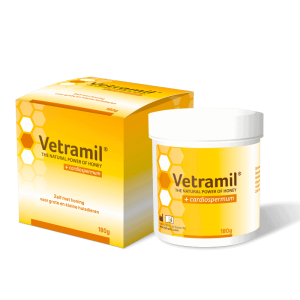 De honingzalf is makkelijk aan te brengen, blijft ook in vochtige omstandigheden goed zitten en bevat een extract van Cardiospermum voor een kalmerende werking. Door de toevoeging van essentiële oliën heeft Vetramil een bittere smaak, waardoor honden en katten minder snel geneigd zijn om te likken, krabben of bijten. Al hun producten zijn bovendien hypoallergeen, vrij van parabenen en zeer zuinig in gebruik.