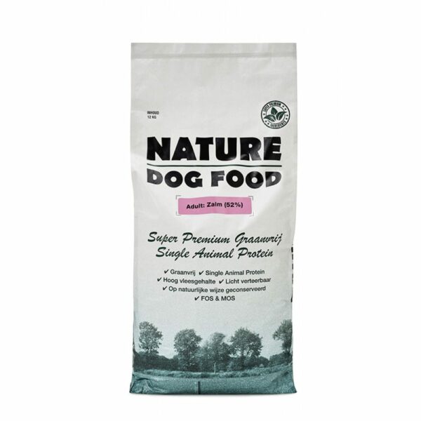 Nature Dog Food is een krokante brok voor volwassen honden met alleen zalm (single animal protein) als dierlijke eiwitbron. De brokken bevatten geen kunstmatige geur- kleur- en smaakstoffen of sojaproducten, rijst, maïs of lactose. Door de toevoeging van alleen natuurlijke tocopherolen, vitamine C, vitamine E en rozemarijn conserveren wij Nature Dog Food en zien wij erop toe dat u alleen de hoogste kwaliteit brokken aan uw hond geeft.
