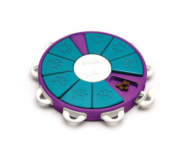 Omschrijving: Het hondenspel de Dog Twister is bedoeld voor de allerslimste honden en dus een echte uitdaging. De schuivende schijven in de vorm van een pizzapunt waarmee de uitsparingen worden bedekt, kunnen worden geblokkeerd en gedeblokkeerd door de witte handvaten die open en dicht moeten worden geduwd. Het hondenspel de Dog Twister valt onder moeilijkheidsgraad 3 en is ideaal voor de (ver)gevorderde speurneus. Geniet van je hond terwijl je toekijkt hoe hij erachter komt hoe hij bij het verstopte snoepje kan komen. Het gaat bij dit spel niet alleen om de verstopte snoepjes maar ook om de mentale uitdagingen. En ook hierbij geldt; een beetje helpen bij het spel mag altijd!