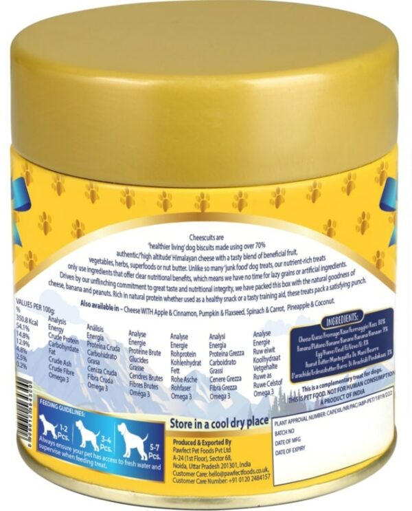 Net als de originele Pawfect Churpi-kauwrepen, worden de cheese biscuits gemaakt volgens hetzelfde traditionele recept en proces. Deze gezonde Pawfect Cheese Biscuits zijn gemaakt van meer dan 70% authentieke Himalaya kaas voorzien van groenten en fruit. De meeste honden vinden banaan en pindakaas geweldig en is dit een van de favouriete smaken. Verpakt in een leuk afsluitbaar blikje en goed voor een gezonde beloning tussendoor. Je kunt de biscuits ook in kleine stukjes verstoppen in bijvoorbeeld een snuffelmat.