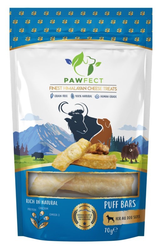Net als de originele Pawfect Churpi-kauwrepen, worden puff bites, strips & bars gemaakt volgens hetzelfde traditionele recept en proces. Maar hebben elk een andere vorm, grootte en beleving geschik tvoor alle hondenrassen.  De puff bars zijn grotere stukken en ideaal te geven als tussendoortje of te breken en te verstoppen in een snuffelmat.