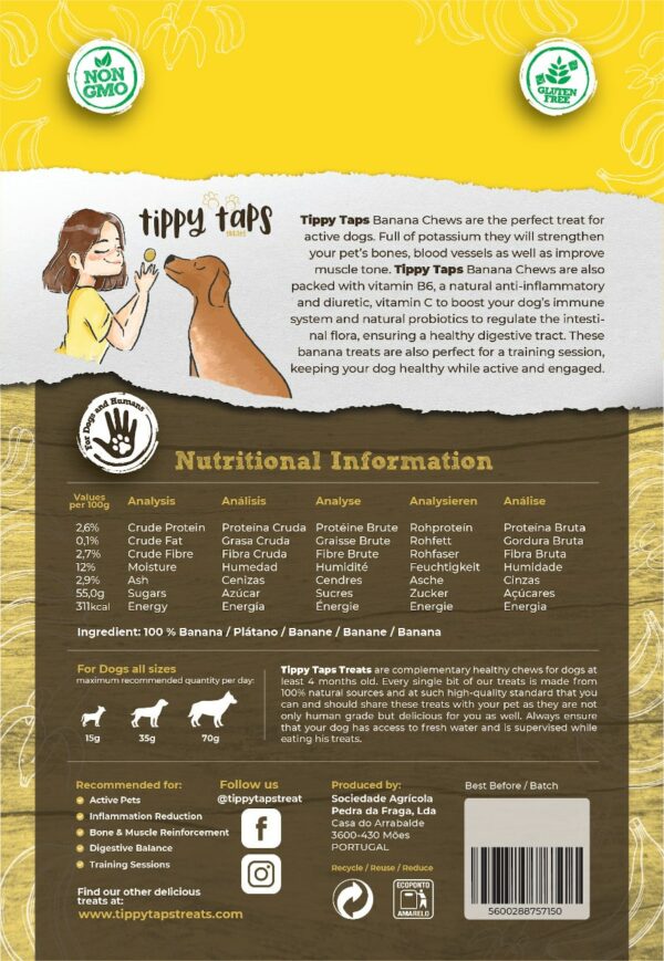 Tippy Taps Banaan snacks zijn de perfecte traktatie voor actieve honden, maar zeker ook geschikt voor alle hondenrassen. Bananen zitten boordevol kalium en zorgen ervoor dat uw hond de hele dag vol energie blijft. Bananen zitten ook boordevol vitamine B6, een natuurlijke ontstekingsremmer, vitamine C om een goed collageengehalte op peil te houden en natuurlijke probiotica om zijn buikje tevreden te houden. Deze hondensnacks zijn perfect voor een trainingssessie, waardoor uw hond blij blijft terwijl hij actief en betrokken is.