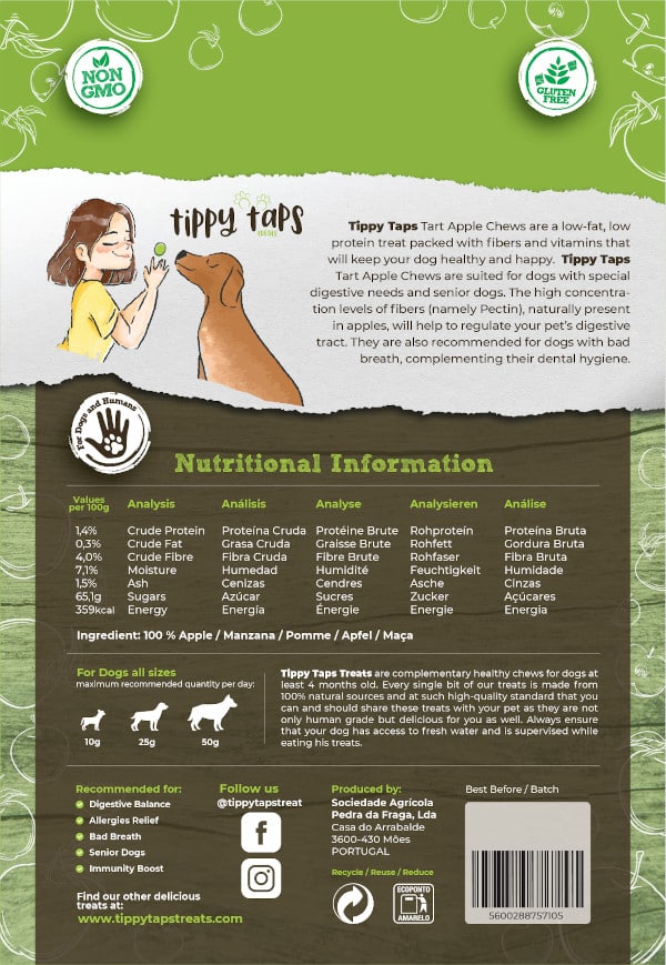 Tippy Taps Tart Appel Chews zijn een vetarme, eiwitarme traktatie boordevol vezels en vitamines. Tippy Taps Appel Chews zijn geschikt voor alle hondenrassen, maar ook voor honden met speciale spijsverteringsbehoeften en oudere honden. De hoge concentratie vezels (met name pectine) die van nature in appels aanwezig zijn, helpen het spijsverteringskanaal van uw huisdier te reguleren. Ze worden ook aanbevolen voor honden met een slechte adem, als aanvulling op hun mondhygiëne.