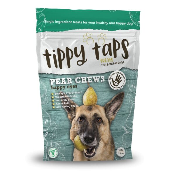 Deze vega hondensnacks van Tippy Taps zijn geschikt voor alle levensfases en hondenrassen. Peren zijn een van de rijkste vruchten als het gaat om vitamine A, maar ook zeaxanthine, een krachtige antioxidant met oog gerelateerde gezondheidsvoordelen, en luteïne, een lichte vezel die het oog beschermt tegen schade door zonlicht. Peren zijn van nature ook rijk aan koper en kalium, beide essentiële voedingsstoffen voor een goede lichaamsfunctie. Deze peer snacks van Tippy Taps kunnen ook een nuttige bron van vezels zijn die kunnen helpen een goed spijsverteringsevenwicht te behouden en bevatten ook weinig eiwitten en vetten. Dit is de perfecte gezonde traktatie, niet alleen voor zowel genieten op een warme zomerdag, maar ook voor een gezonder leven.