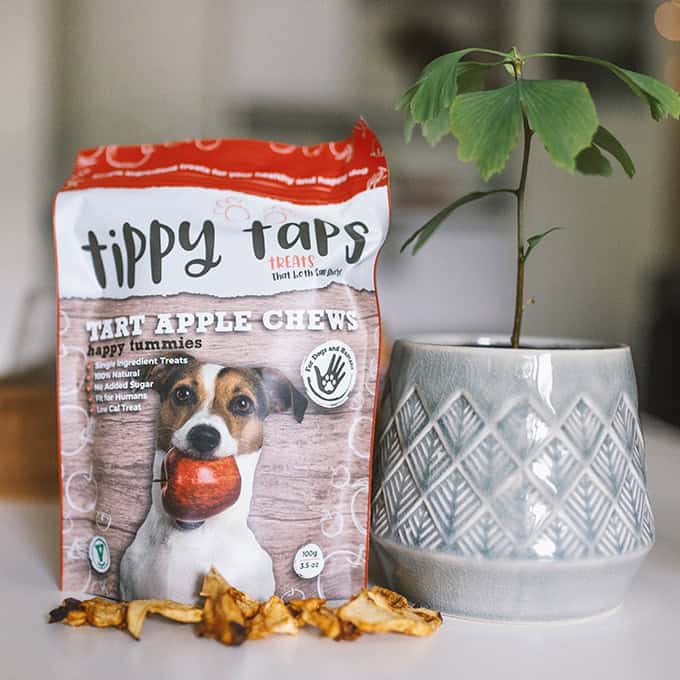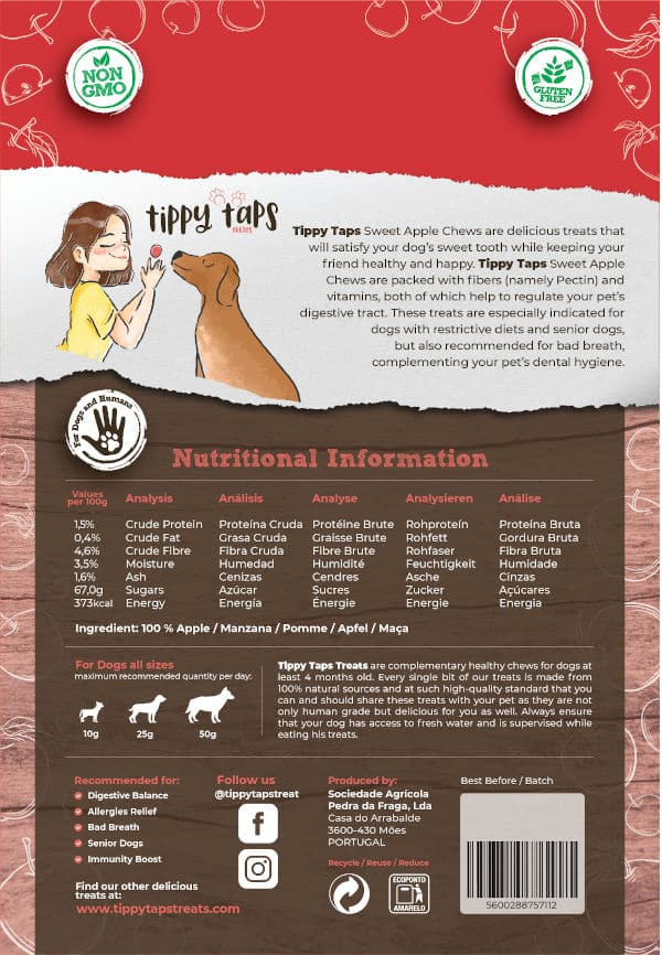Tippy Taps zoete appel snacks zijn een vetarme, eiwitarme traktatie boordevol vezels en vitamines die uw hond gezond en gelukkig houden. Deze vega hondensnacks zijn geschikt voor honden met speciale spijsverteringsbehoeften en oudere honden. De hoge concentratie vezels (met name pectine) die van nature in appels aanwezig zijn, helpen het spijsverteringskanaal van uw hond te reguleren. Ze worden ook aanbevolen voor honden met een slechte adem, als aanvulling op hun mondhygiëne.