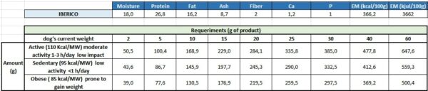 Samenstelling: 75% vers varkensvlees, 20% zoete aardappel, 3% gezondheidsmix: (banaan (5982mg/kg), artisjok (5085 mg/kg), cichorei, luzerne (2991 mg/kg), appels(2692 mg/kg), pompoen (2393 mg/kg), bosbessen (2094 mg/kg),groenlipmossel (1196 mg/kg), rozemarijn (897 mg/kg), tijm (598 mg/kg),origan (449 mg/kg), Mariadistel, spirulina (239 mg/kg), olijfolie, yucca),1% forelolie, glucosamine (1000 mg/kg), chondroïtine (850 mg/kg), MSM(650 mg/kg).